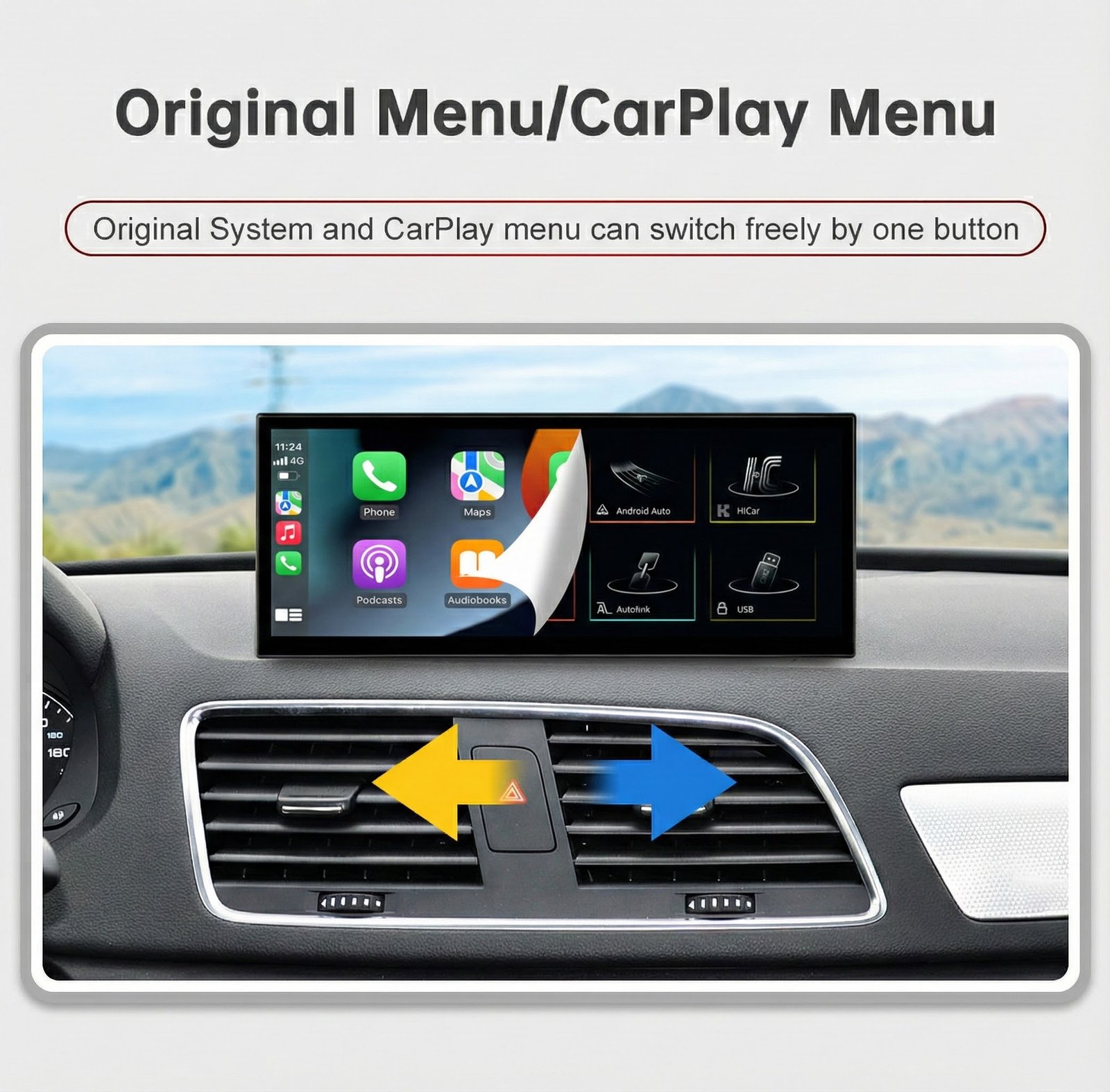 Visiškai plug-and-play diegimas naudojant originalią Audi laidų sistemą — nereikia kodavimo, jungčių ar laidų pjovimo. Bet kuriuo metu akimirksniu perjunkite tarp originalios Audi MMI sąsajos ir CarPlay/Android Auto.