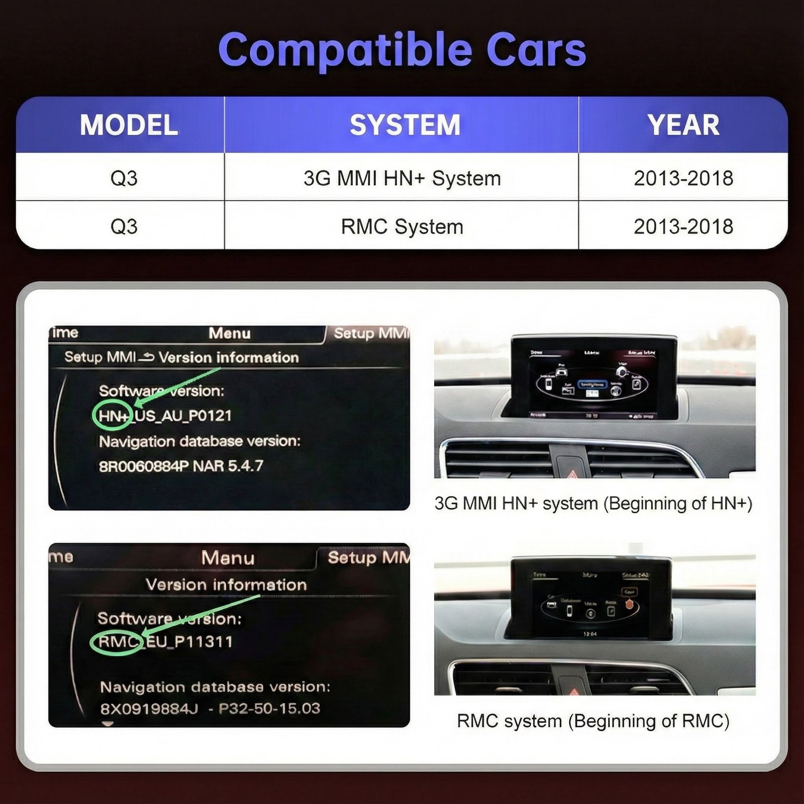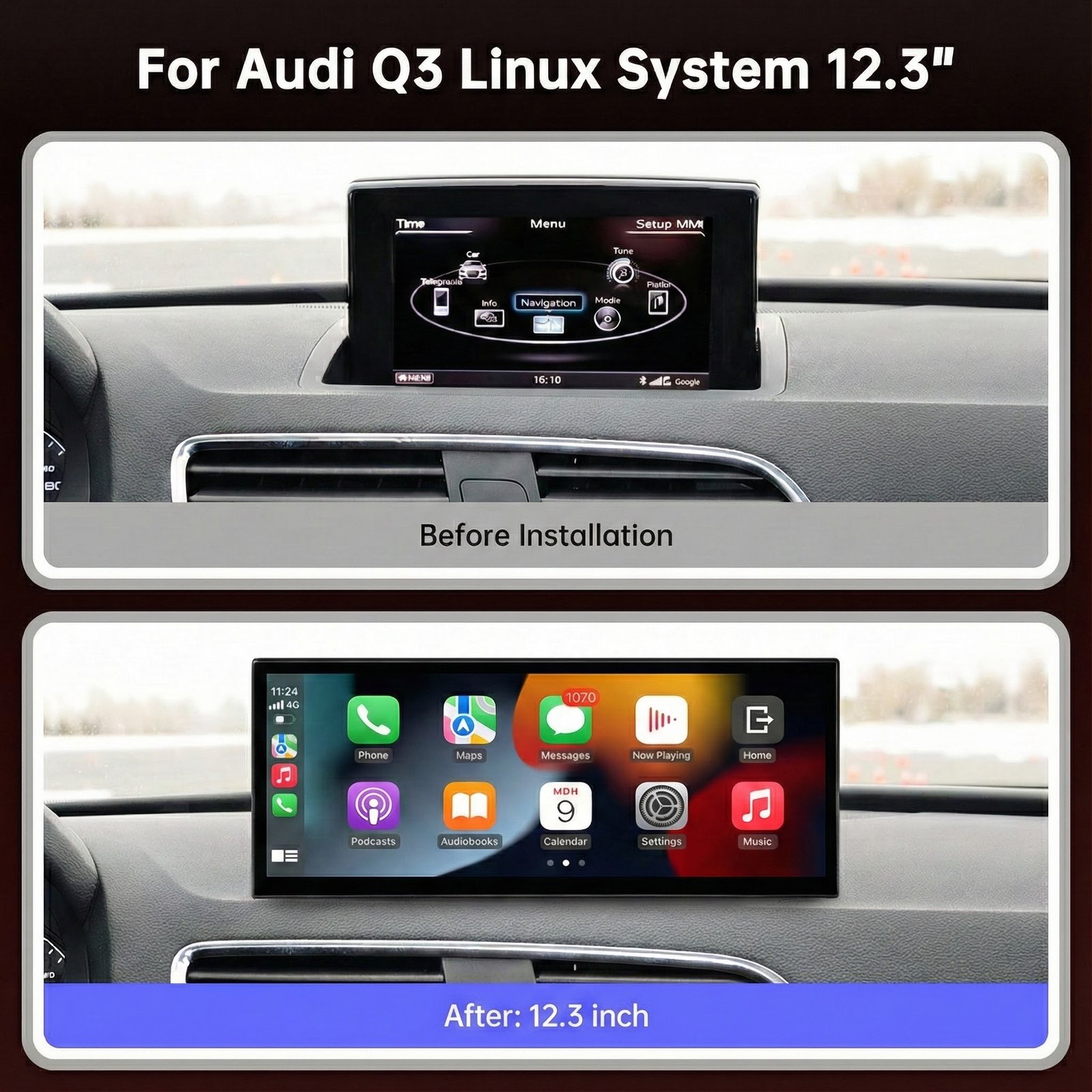 Atnaujinkite savo Audi Q3 8U arba Q3 F3 (2011–2018) su šiuo aukščiausios klasės 12,3″ Linux multimedijos liečiamu ekranu, sukurtu specialiai MMI 3G ir RMC sistemoms. Šis aukštos raiškos IPS ekranas pakeičia jūsų gamyklinį ekraną, išlaikydamas visišką suderinamumą su visomis originaliomis Audi funkcijomis. Turintis 1920×720 HD skydelį ir sklandų veikimą, jis suteikia modernią, intuityvią ir funkcijomis turtingą sąsają jūsų Q3 salone.